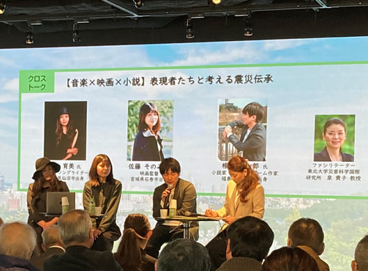 東北大学災害科学国際研究所の泉教授が聞き手となり、シンガーソングライターの熊谷育美氏、映画監督の佐藤そのみ氏、小説家・脚本家の根本聡一郎氏に、それぞれの作品に込めた震災の経験や思い、災害における文化芸術の力や可能性などについてお話しいただきました。文化芸術には未来を支える力があることを実感できる、貴重な学びの機会となりました。