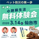 ペットの防災対策で最も緊急度が高いのは、命をつなぐ技術です。本ワークショップでは、犬猫の心肺蘇生(CPR)を専用器材で体験できます。